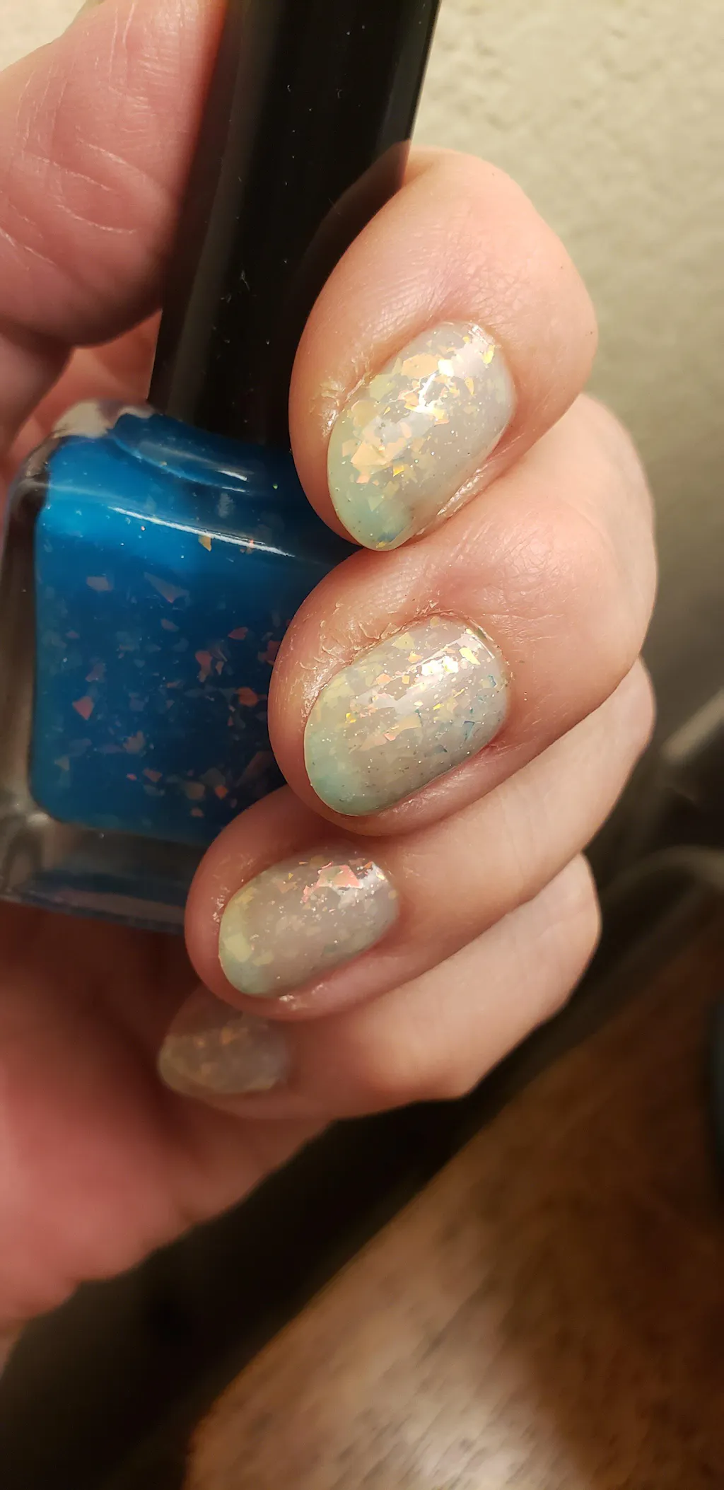 Koi Pond is a jelly thermal nail polish that is blue in the cold state and a translucent white in the warm state with fire-red iridescent flakes and a light scattering of holographic glitter.