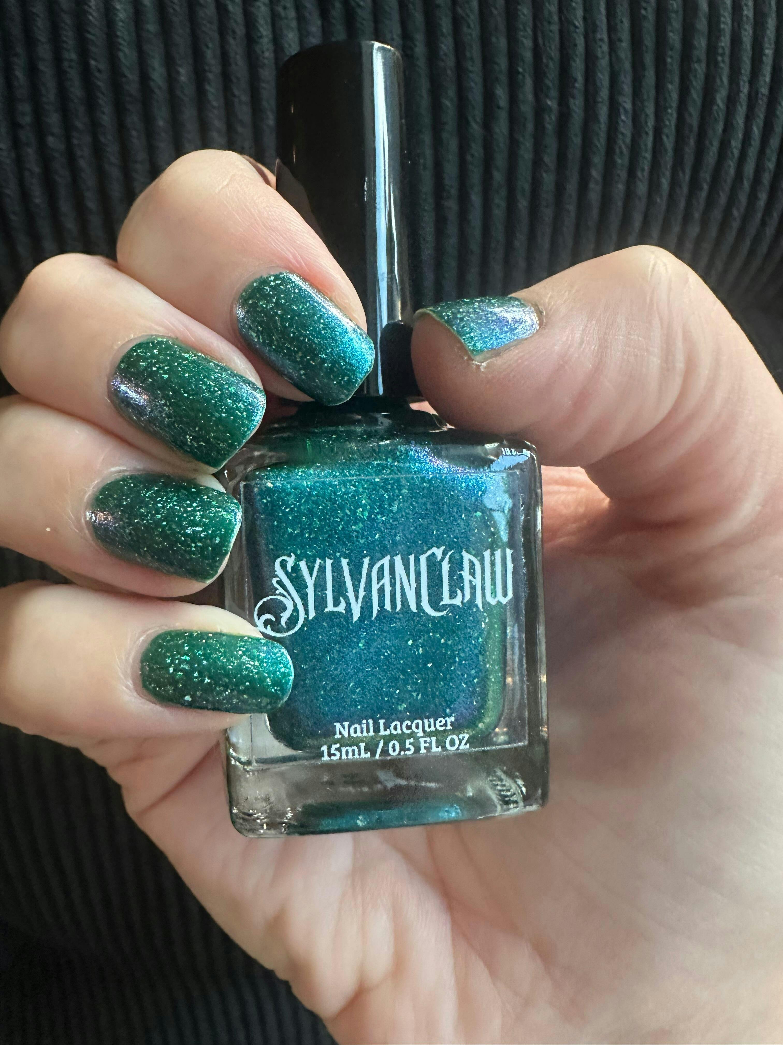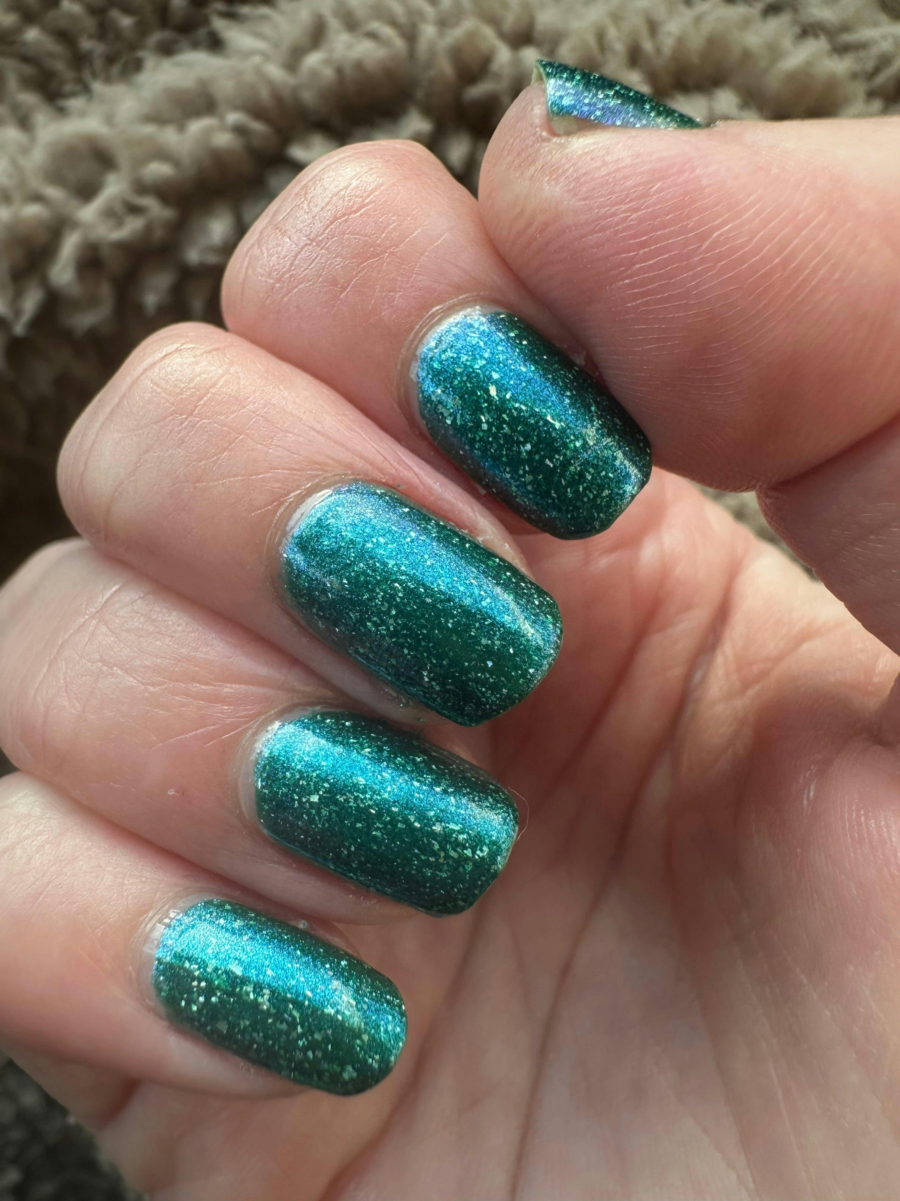 A dark forest green nail polish that leans teal with smooth holographic flakes and a blue shimmer that can shift to purple in some lighting